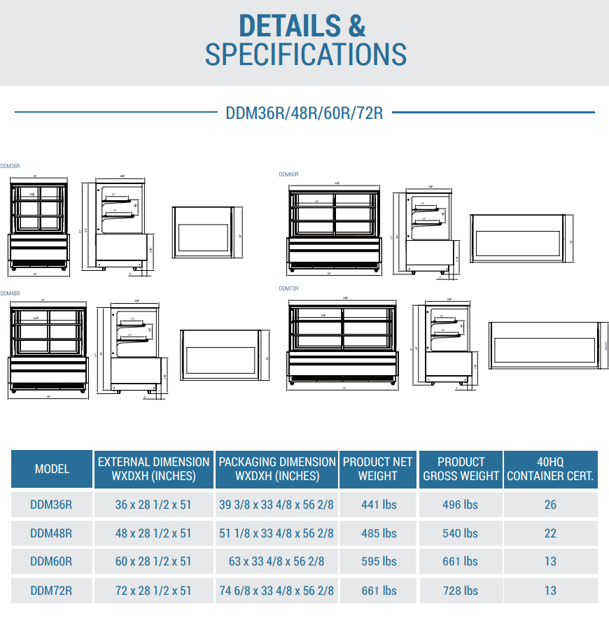 The Dukers DDM36R is a sleek refrigerated cake showcase designed to elegantly display your confections while keeping them fresh. With two shelves providing three levels of display space, it offers ample room for your creations. Its temperature range of 33°F to 41°F ensures optimal storage conditions, supported by features like automatic defrost and the environmentally friendly R290 refrigerant. The showcase boasts a stainless steel interior and exterior with a stylish black finish, complemented by straight and side glasses for enhanced visibility. Equipped with LED lighting both inside and on the canopy, as well as a digital temperature display and a NEMA 5-20P plug for easy installation, it combines functionality with aesthetics to elevate your dessert presentation.