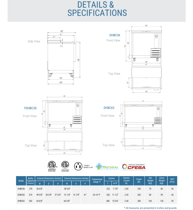 The Dukers DHBC36 is a reliable 36" bottle cooler designed for efficient beverage chilling in any setting. With a spacious 7.875 cu. ft. capacity and lockable sliding stainless steel lids, it offers ample storage while ensuring security. Its self-contained refrigeration system, along with a mechanical controller and ventilated cooling system, guarantees precise temperature control between 33°F to 41°F, ideal for keeping beverages refreshingly cold. Equipped with standard bottle opener and cap catcher for added convenience, it boasts features like automatic defrosting and a stainless steel exterior and interior for easy maintenance and durability. Using R290 Hydrocarbon refrigerant, and powered by a 1/5 HP motor, this cooler is energy-efficient and environmentally friendly. With cETLus and ETL-Sanitation certifications, it ensures both safety and sanitation standards are met, making it a dependable choice for any beverage service establishment.