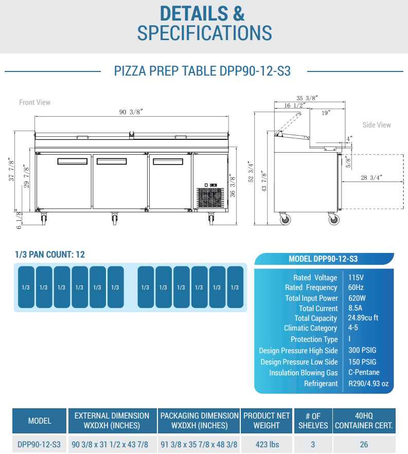 The Dukers DPP90-12-S3 commercial pizza prep table is constructed of heavy duty stainless steel to be durable and resilient to harsh kitchen environments. Keeps toppings and ingredients insulated with a hinged cover. Includes 12 1/3 pan containers to keep food organized and ready to use. The bottom conveniently holds additional items with 3 removable wire shelves that can be adjusted. With a range of 33°F to 41°F, it chills and safely stores all type of food. Digital temperature controls and LED display lets you precisely pick the desired temperature. Designed with a bottom mounted 1/2 HP compressor for efficiency.